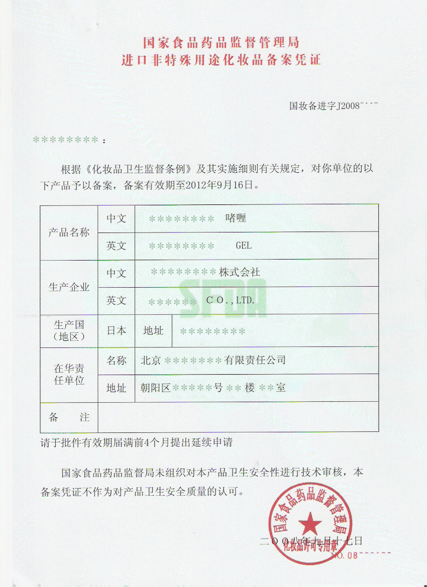 《中华人民共和国卫生部 进口非特殊用途化妆品备案凭证》